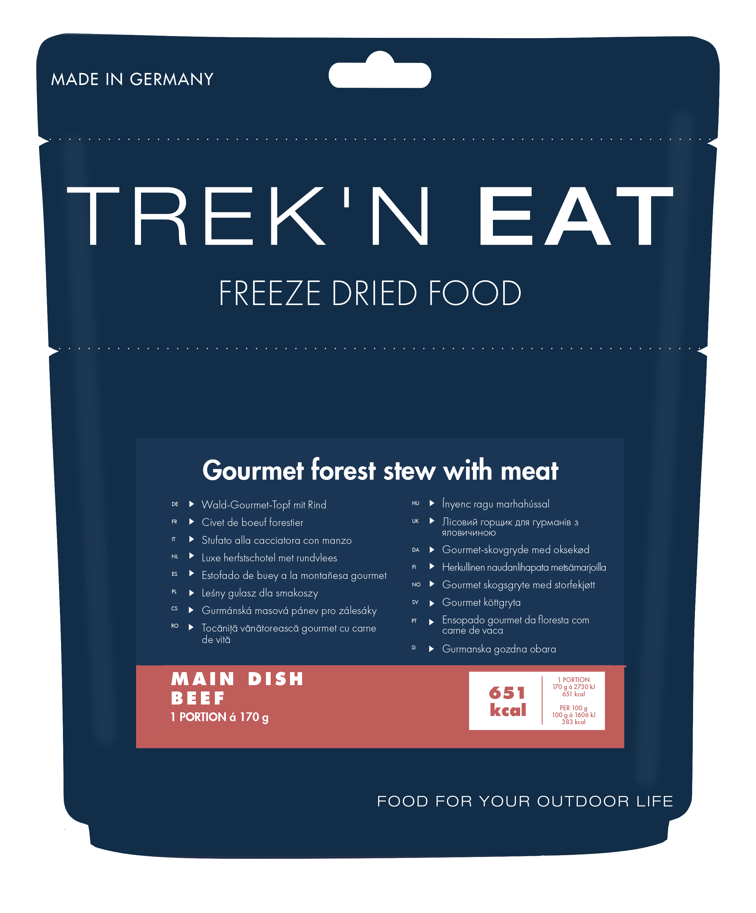 Ein Gericht für echte Gourmets: geschmackvolles und Rindfleisch in Kombination mit Champignons und Zwiebeln. Vervollständigt wird dieses Trek'n Eat Gericht mit Nudeln, die für ausreichende Kohlenhydrate sorgen. Das Geschmackserlebnis ist ab dem ersten Biss einfach lecker und das Gericht ist höchst bekömmlich. Schnell werden Sehnsüchte nach Trekking-Touren durch farbige Herbstwälder oder Kajakabenteuer auf einsamen Seen geweckt. Der Wald-Gourmet-Topf mit Rind fängt den Geschmack der wilden Natur ein, egal, wo Sie sich gerade befinden.