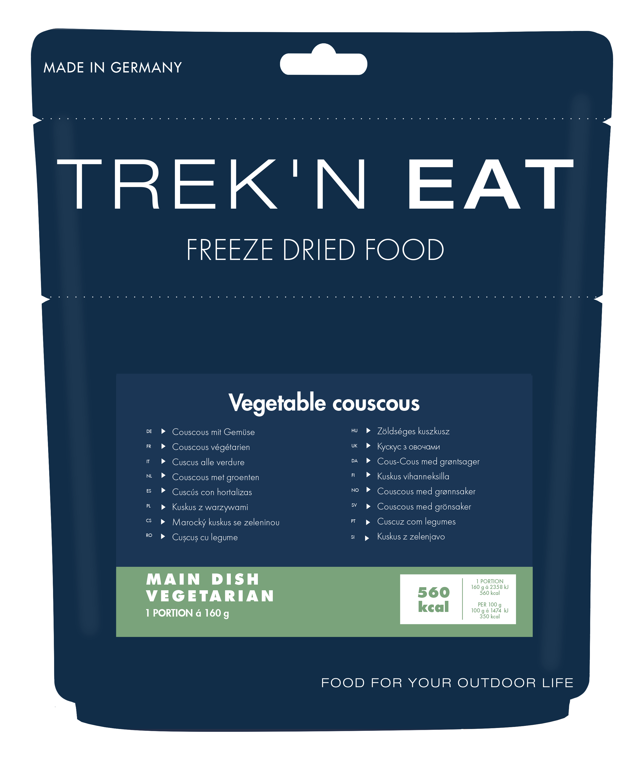 Nordafrikanischer Genuss und vegetarische Frische: Das neue Couscous mit Gemüse ist der perfekte Mix für alle, die gut gestärkt mit einem und extrem leckeren Gericht unterwegs sein wollen. Für frischen Geschmack sorgen verschiedenste Gemüsesorten, die sich harmonisch mit den typischen Gewürzen und dem Hartweizengriess aus der nordafrikanischen Küche verbinden. Einfach kochendes Wasser bis zur Fülllinie direkt in den wieder verschliessbaren Standbeutel giessen, umrühren, kurz ziehen lassen und den Hauch von Marokko geniessen. Das leichte und fettarme Gericht von Trek'n Eat wird zum Muss bei jedem Outdoor-Abenteuer.