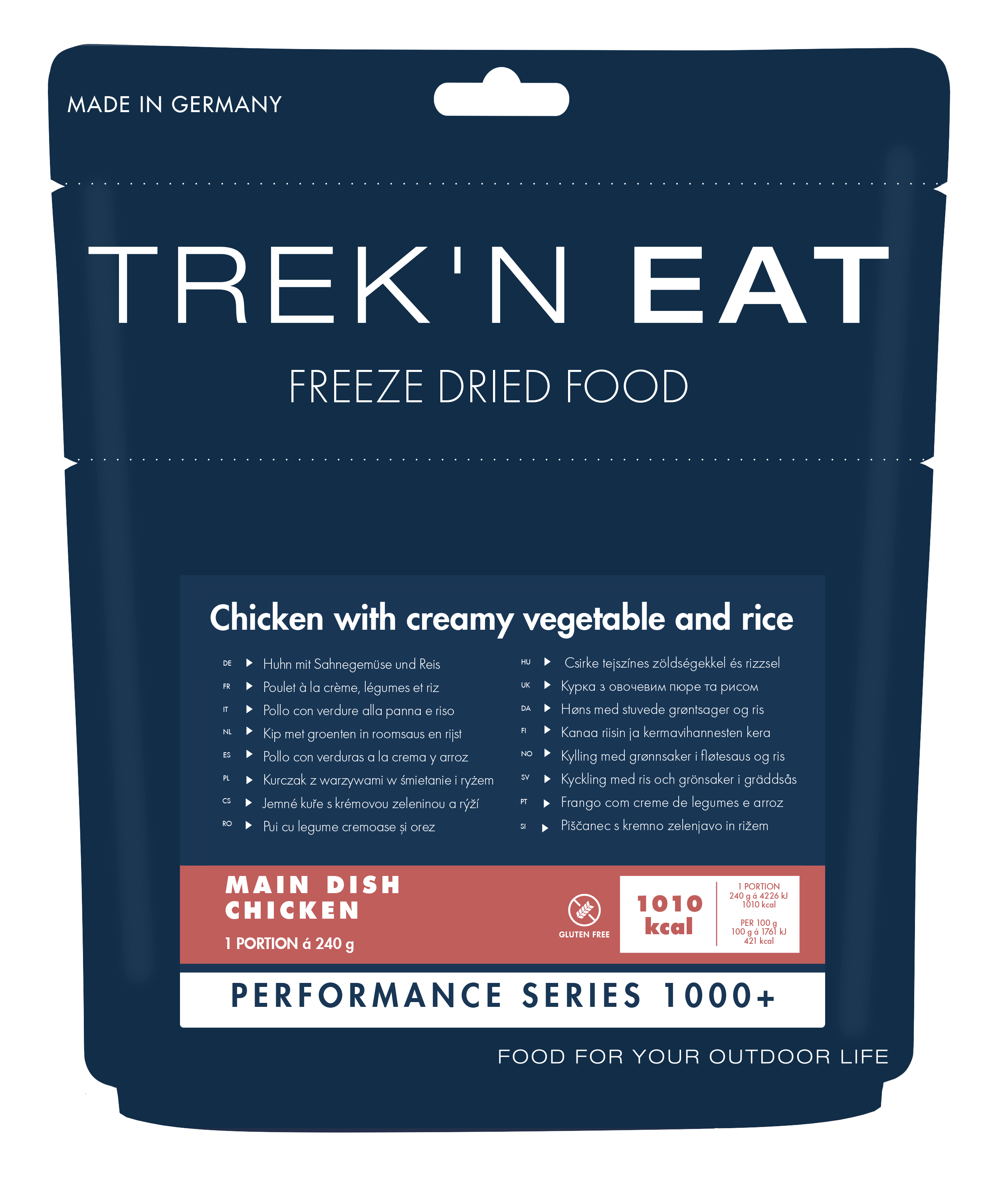 Auch dieses sämige Reisgericht liefert mit 1011 kcal die nötige Energie für köperliche Anstrengungen in der Natur und punktet mit wertvollem Eiweiß und Vitaminen. Was zu Hause Hühnerfrikassee heißt, serviert Trek'n Eat als köstliche Mahlzeit für unterwegs, die mit wenigen Handgriffen gezaubert ist und den Körper langanhaltend mit Nährstoffen versorgt.