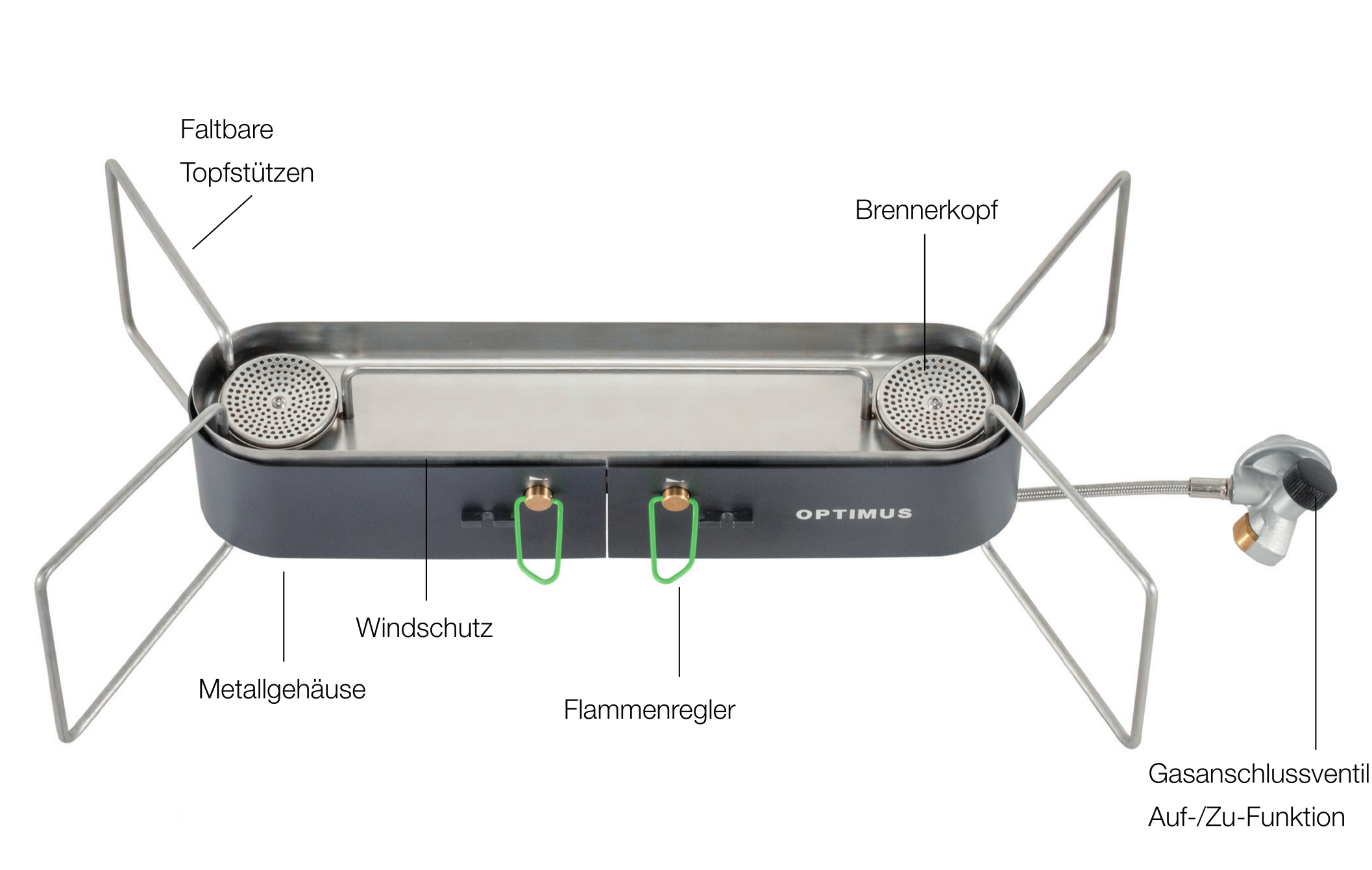 - Brenndauer: 165 Minuten bei voller Leistung (mit 450 g Optimus-Gas und einem Brenner)